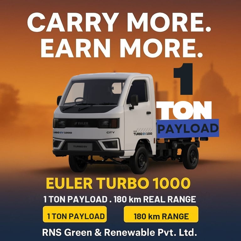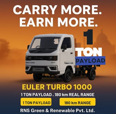 At RNS Green and Renewable Pvt. Ltd., we bring you the complete lineup of Euler Motors' electric vehicles — trusted by businesses across Howrah, Hooghly, Kolkata, South 24 parganas, and beyond. Whether you need a reliable 3-wheeler for daily operations or a powerful 4-wheeler for heavy-duty transport, our EVs offer high payload capacity, long range, and fast charging to keep your business moving efficiently and sustainably.